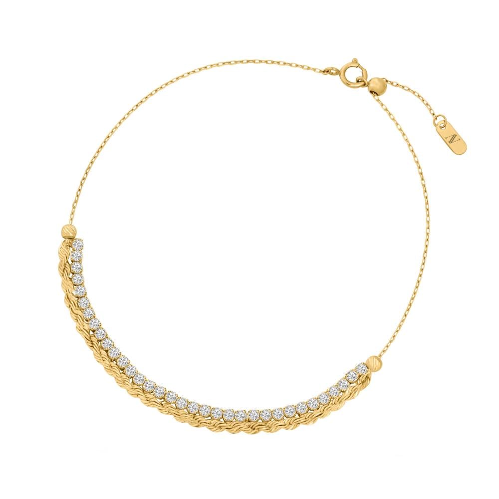 سوارة تمزج لمعة فصوص التنس مع انسياب الذهب المبروم، كأنها خيط ضوء يلتف حول يدك. ناعمة، بس حضورها ما ينشاف… يُحس