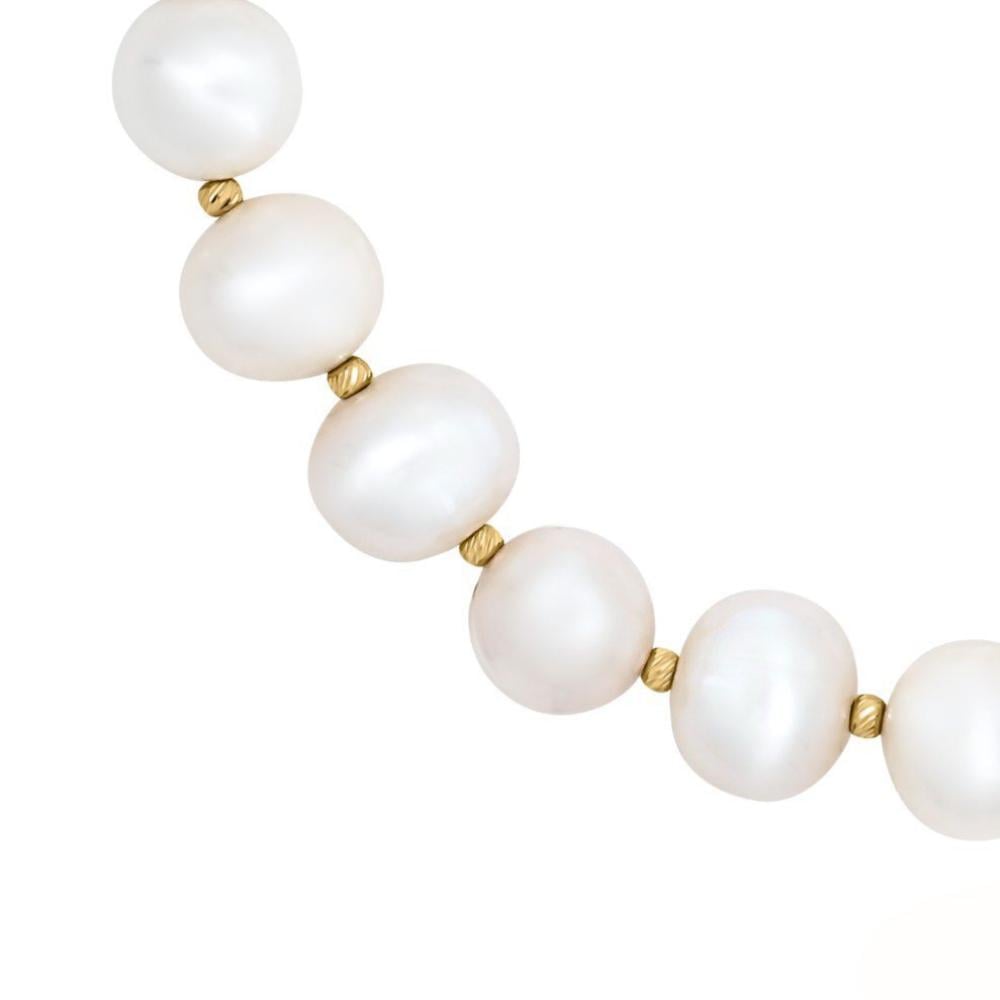 سوارة الملكة… مزيج راقٍ من لآلئ المياه العذبة الكبيرة وكور ذهب صغيرة محفورة بتقنية الليزر. تصميم يليق بالمكانة، ناعم في شكله، ملكي في حضوره